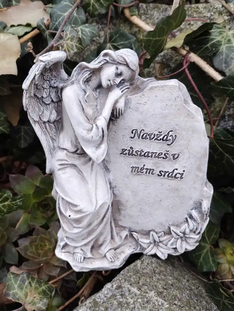 Anděl s náhrobním kamenem s nápisem ,,Navždy zůstaneš v mém srdci´´ je vyroben z polystonu.
