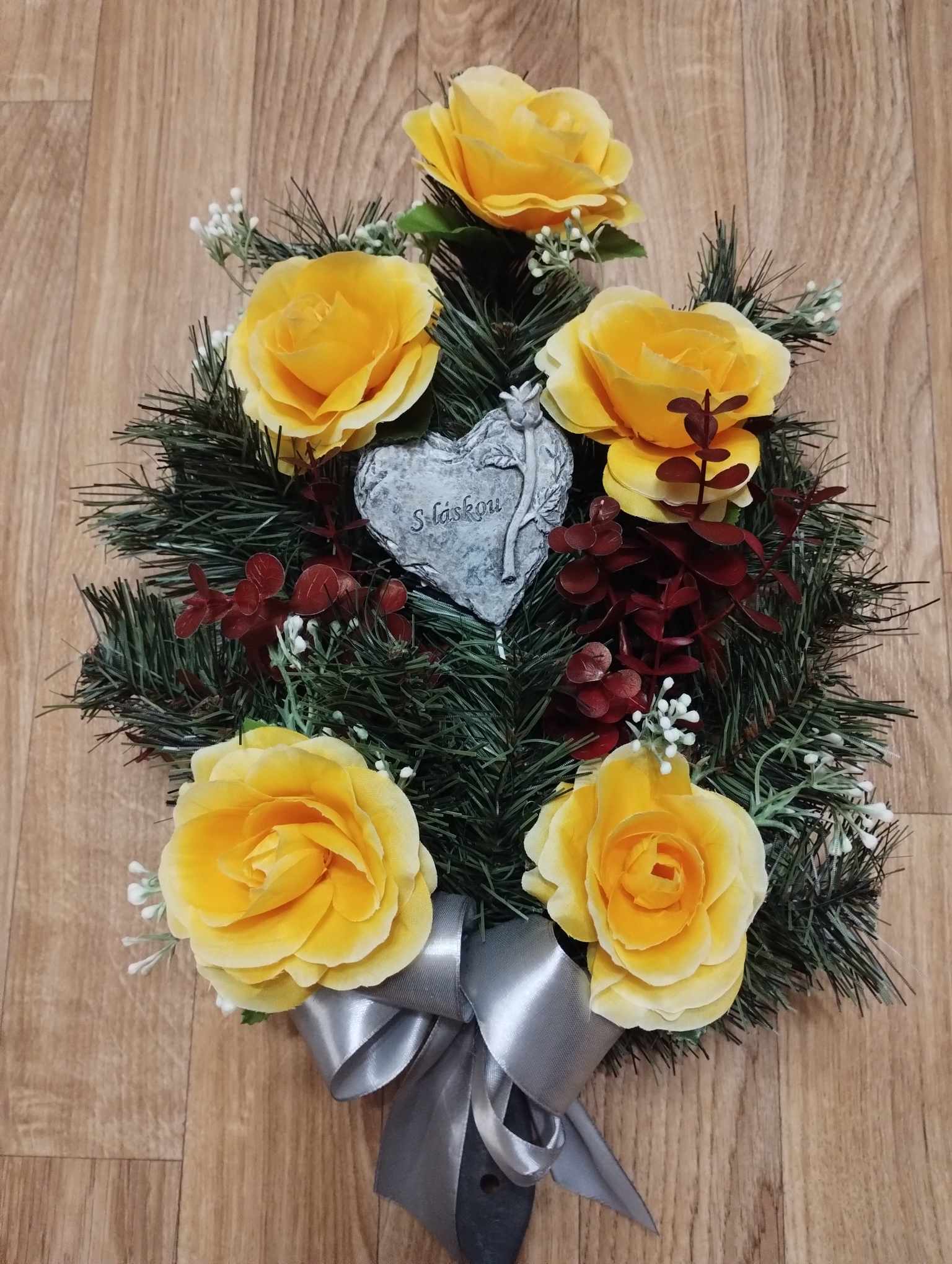 Materiál : umělé chvojí, látkové růže , mašle, srdíčko polyston.