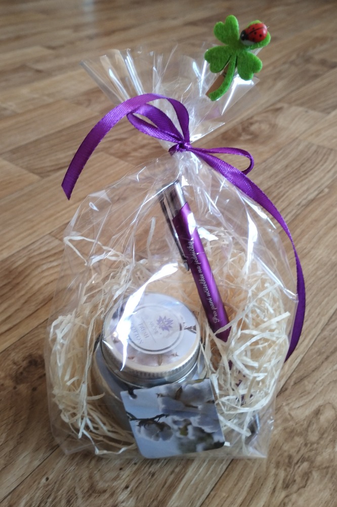 Dárkový balíček pro paní učitelku - obsahuje svíčku s vůní bavlny a mikrotužku s nápisem Paní učitelce na jedničky. Vše zabaleno v celofánovém sáčku s mašličkou a dřrvěným kolíčkem se čtyřlístkem a beruškou pro štěstí.