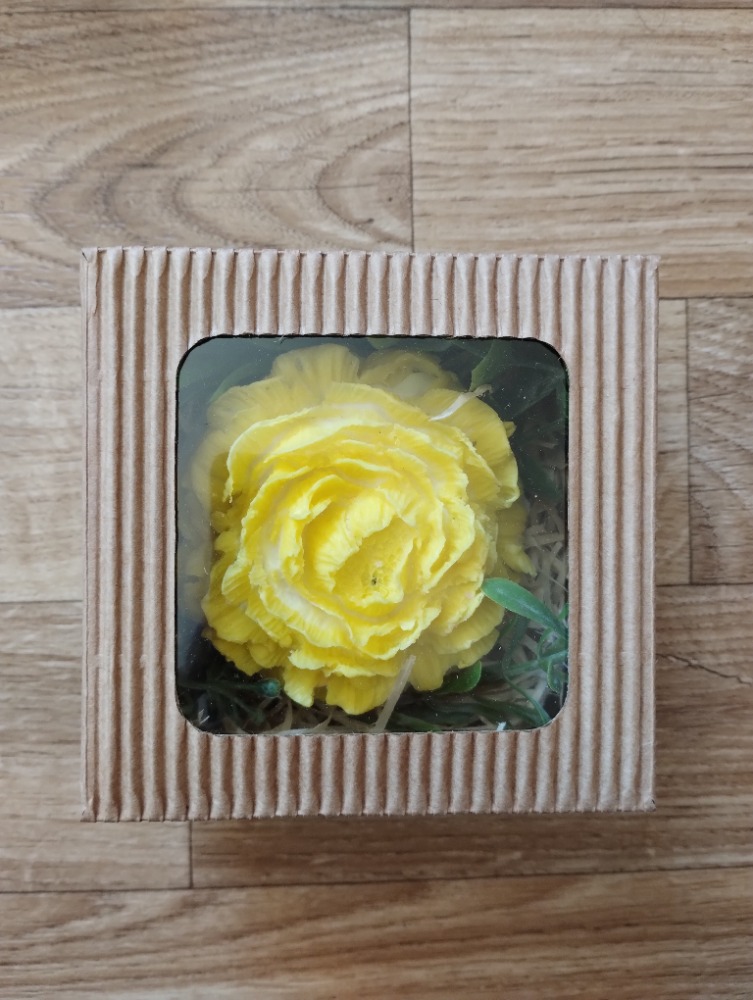 Dekorační mýdlová květina s vůní kokosu - pivoňka žluto bílá. Květina na uložená v dárkové papírové krabičce s plastovým průhledem, dodekorovaná plastovými květinami.