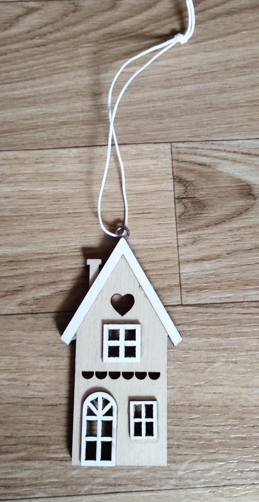 Dřevěné domečky můžete pověsit na dekorační věnce, vánoční stromeček i větvičky ve váze. Zajímavě vyniknou také na zabalených dárcích. Jsou lehoučké, mají působivě zpracované detaily, výřezy a poutko ze šňůrky.
