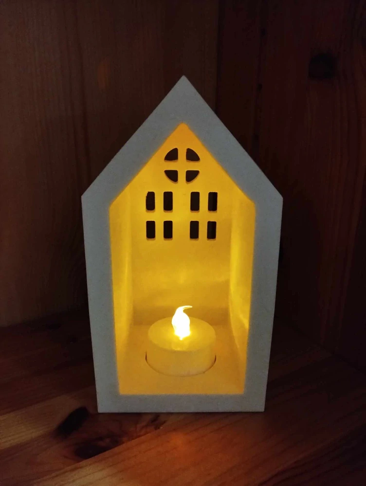 Dekorace na elektronickou svíčku ve tvaru domu, barva bílá, materiál litá keramická hmota Efkostoune.