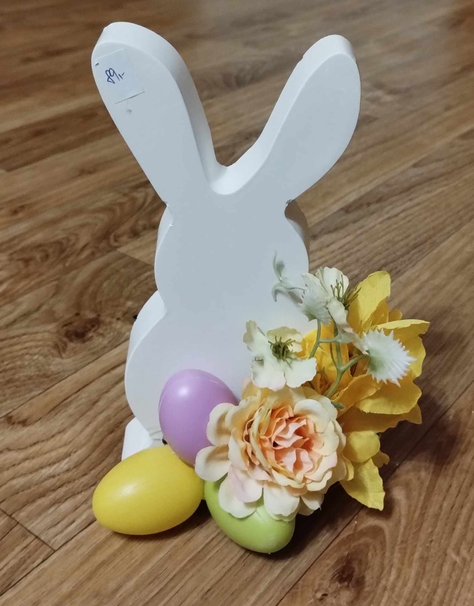 Králíček / zajíček , vel. 18x9x3,5cm, zdobený plastovými vajíčky a kytičkou. Samostatně stojící. Materiál Heliodur.