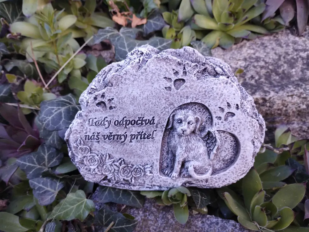 Náhrobní kámen pro pejska s nápisem ,,Tady odpočívá náš věrný přítel´´ je vyroben z polystonu.