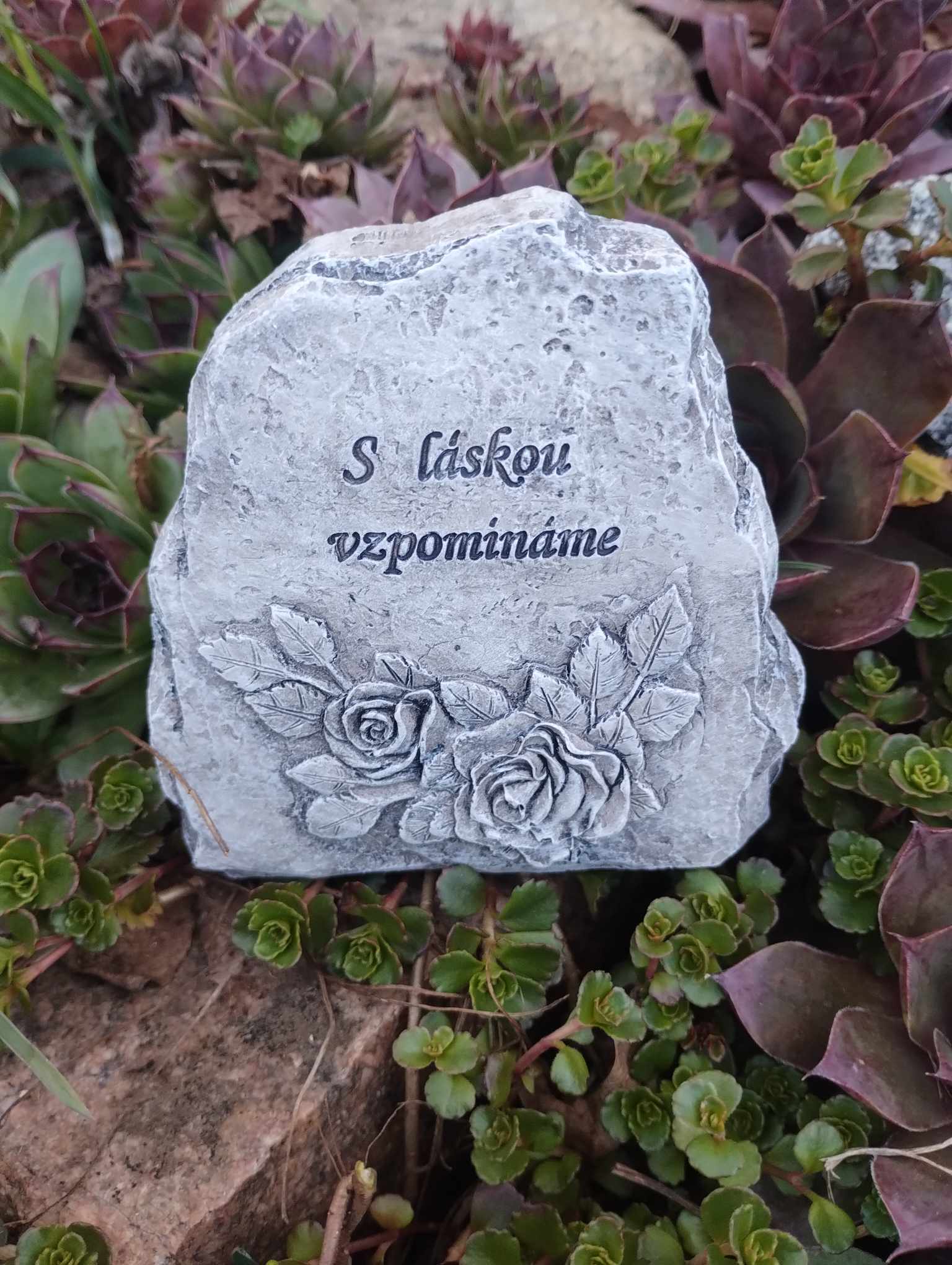 Náhrobní kámen zdobený růžemi a nápisem ,,S láskou vzpomínáme´´ je vyroben z polystonu.