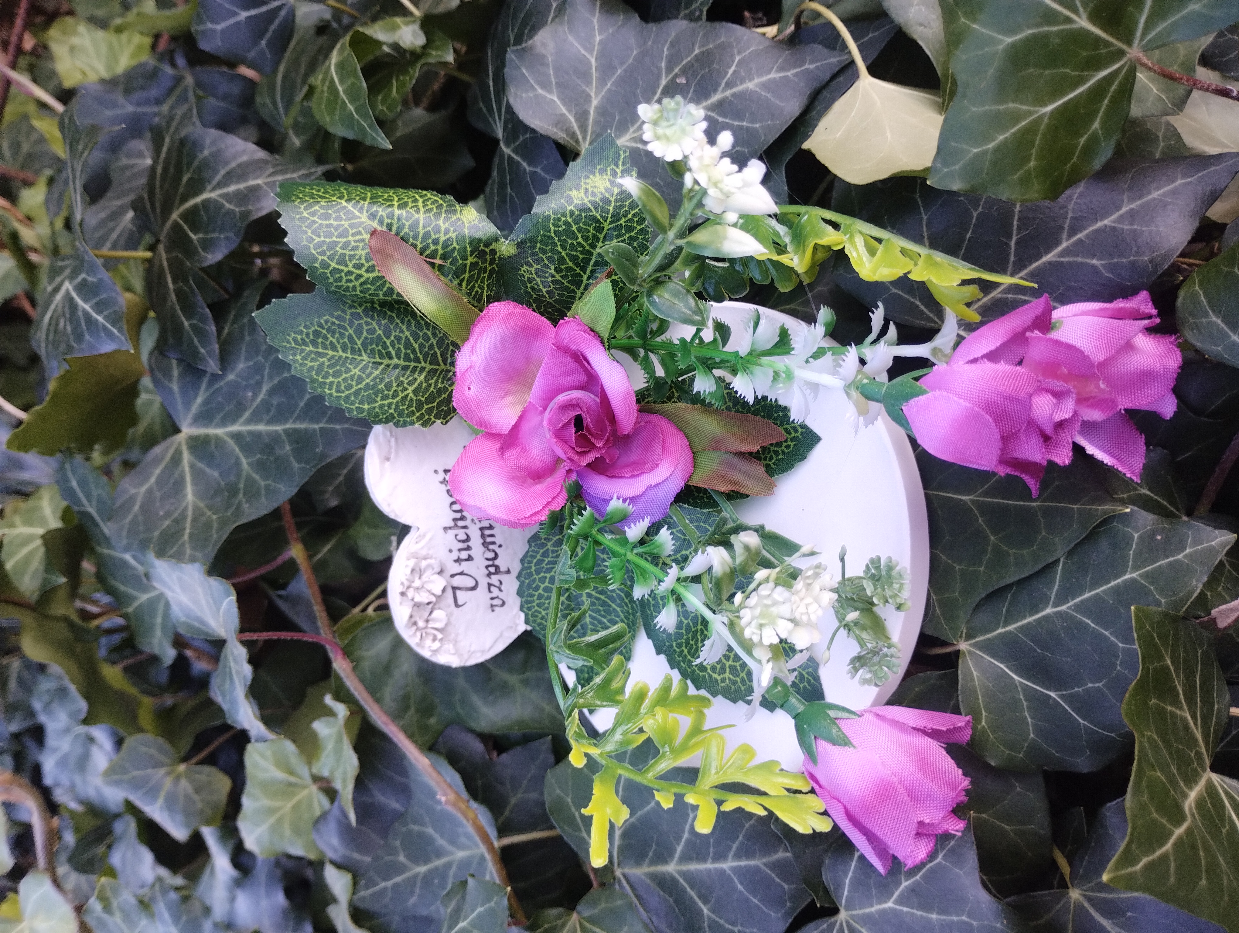 Smuteční dekorace, srdce s nápisem V tichosti vzpomínáme , bílé, tm. růžové látkové růže a dekorační plastové květiny. Průměr 10cm.
