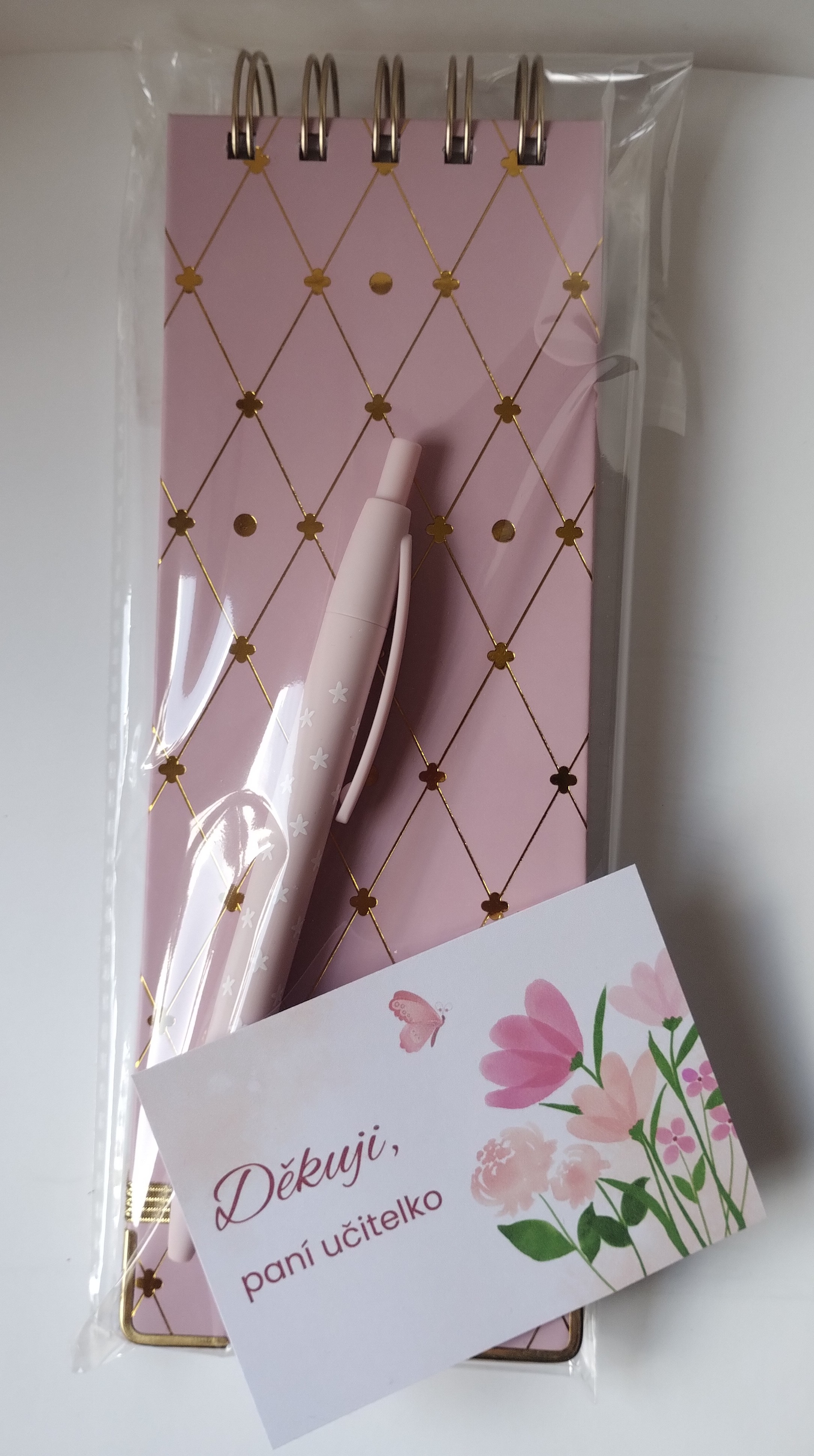 - Růžový notes s tužkou pro paní učitelku
