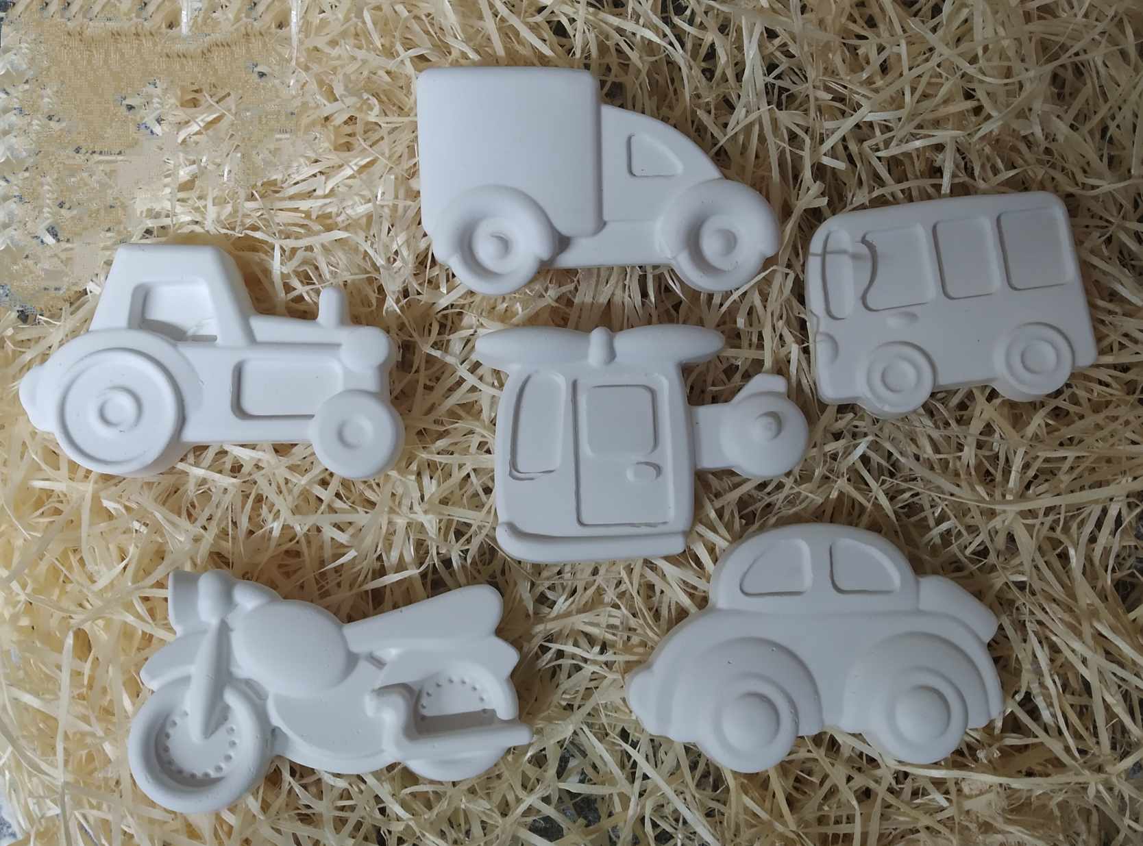 Sada sádrových magnetek ve tvaru dopravních prostředků. V sadě 6 ks, je možné že se v odlitku objeví bublinky.