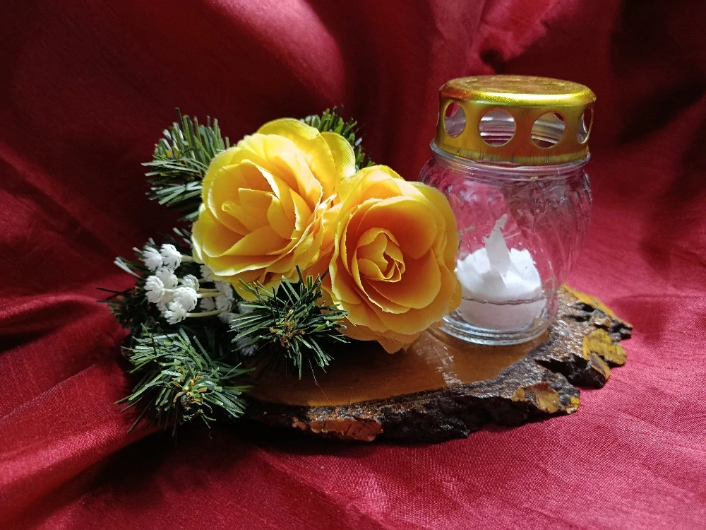 Smuteční dekorace na dřevěné lakované kulatince se skleněným svícnem (uvnitř elektronická svíčka), dozdobené látkovými květy. Velikost kulatinky cca 20x10cm.