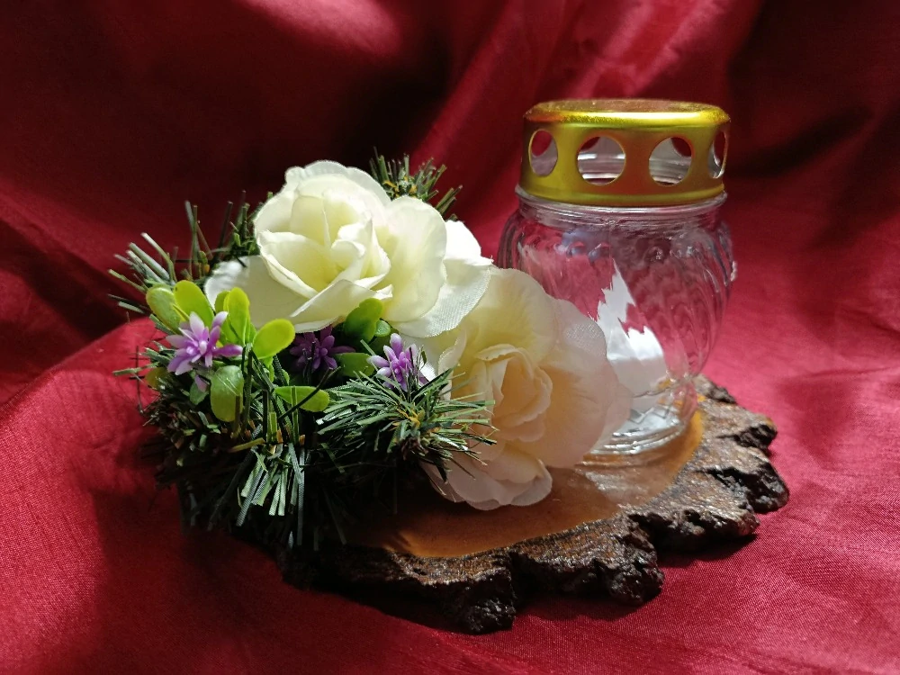 Smuteční dekorace na dřevěné lakované kulatince se skleněným svícnem (uvnitř elektronická svíčka), dozdobené látkovými květy. Velikost kulatinky cca 20x10cm.