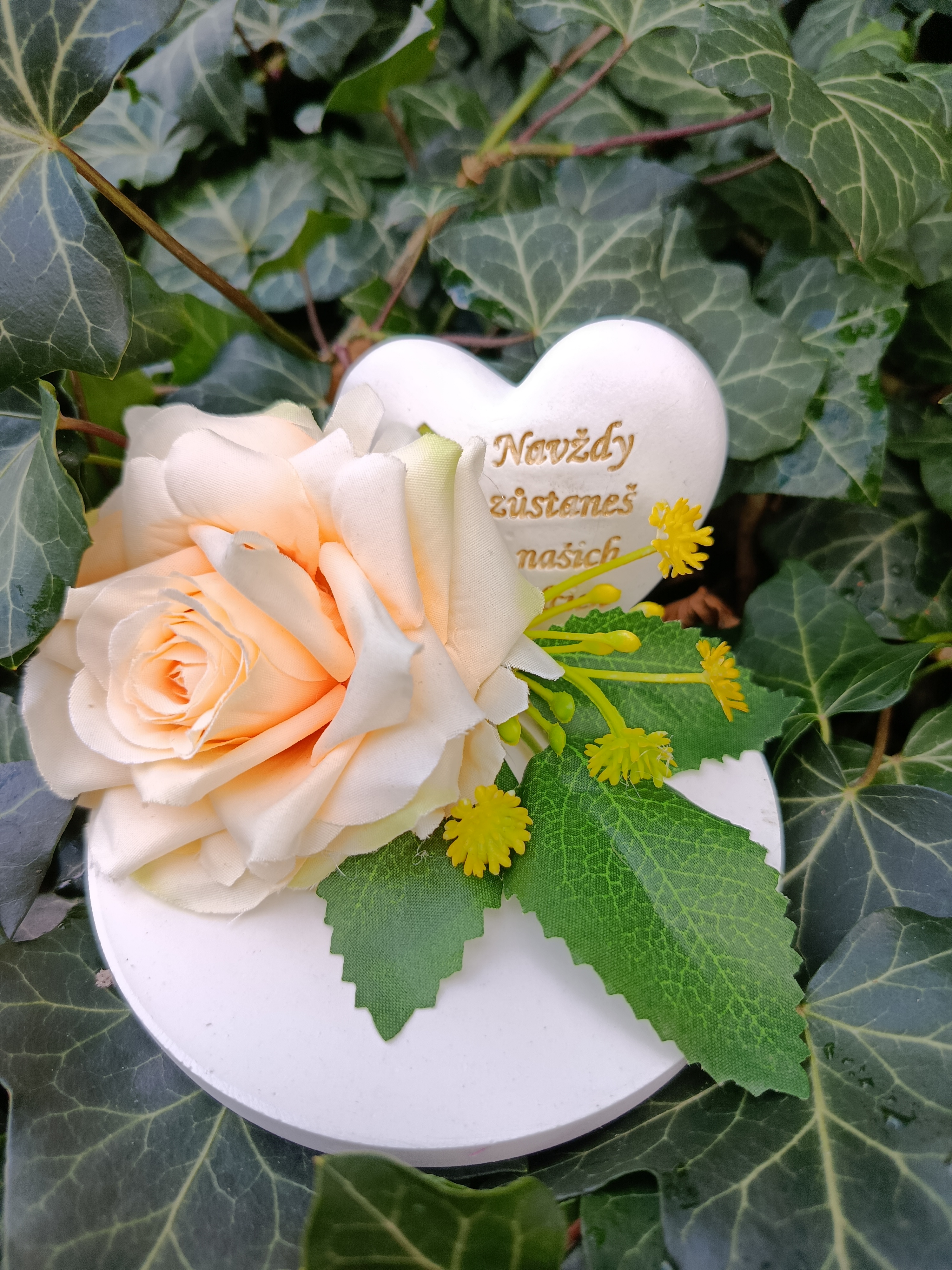 Smuteční dekorace se srdíčkem s nápisem Navždy zůstaneš v našich srdcích. Zlatý nápis, žlutá růže.