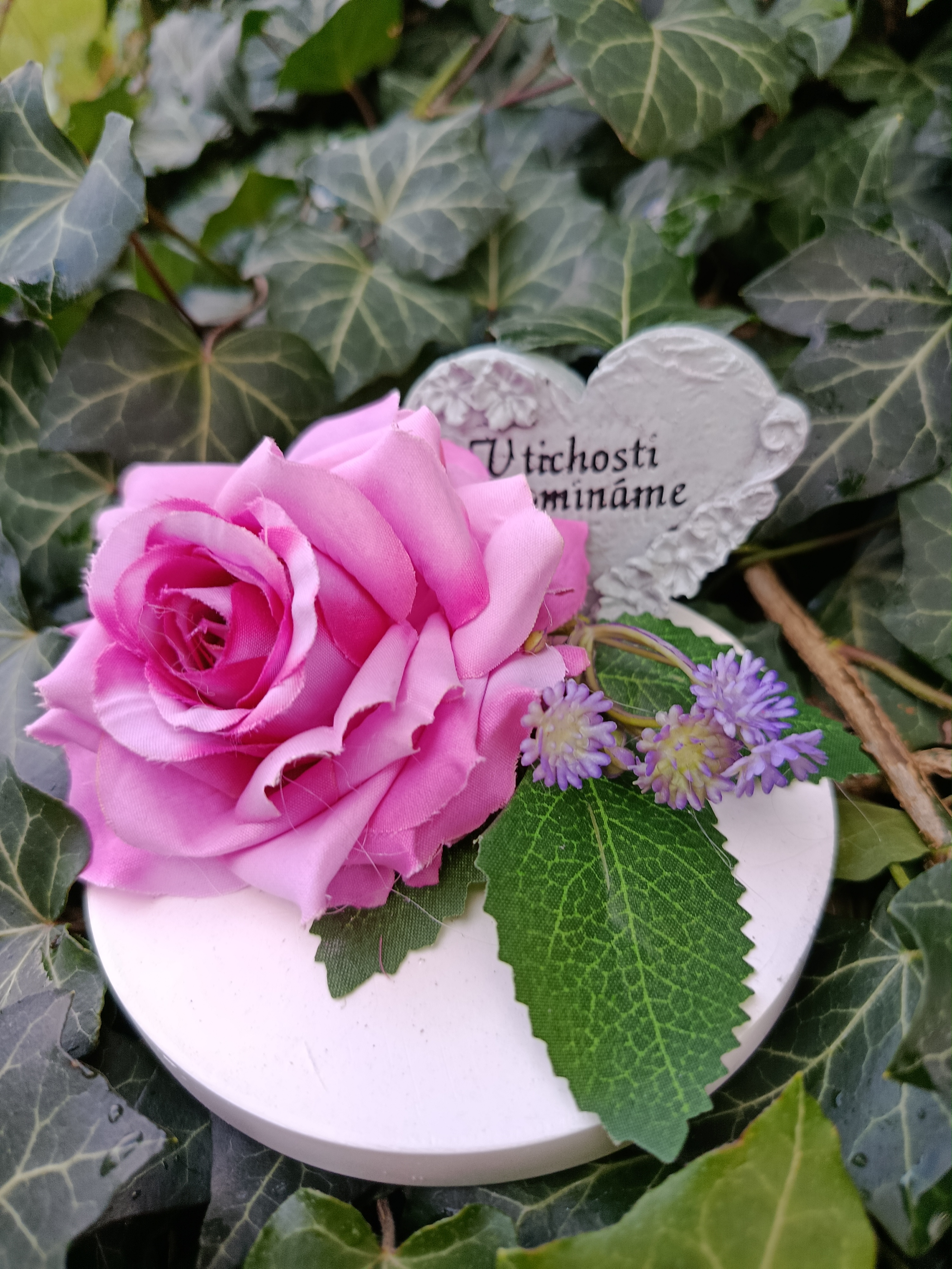 Smuteční dekorace, šedé srdíčko s nápisem V tichosti vzpomínáme, růžová růže látková. Průměr podstavce 10cm.