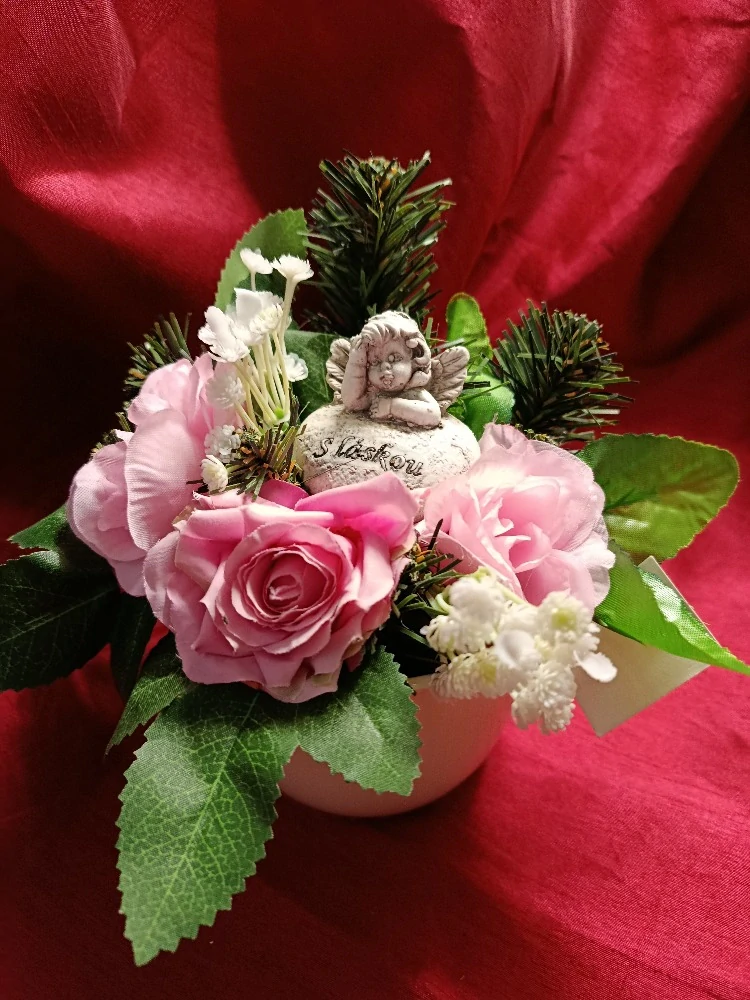 - Smuteční dekorace v keramickém obalu, srdíčko s andělíčkem S láskou.