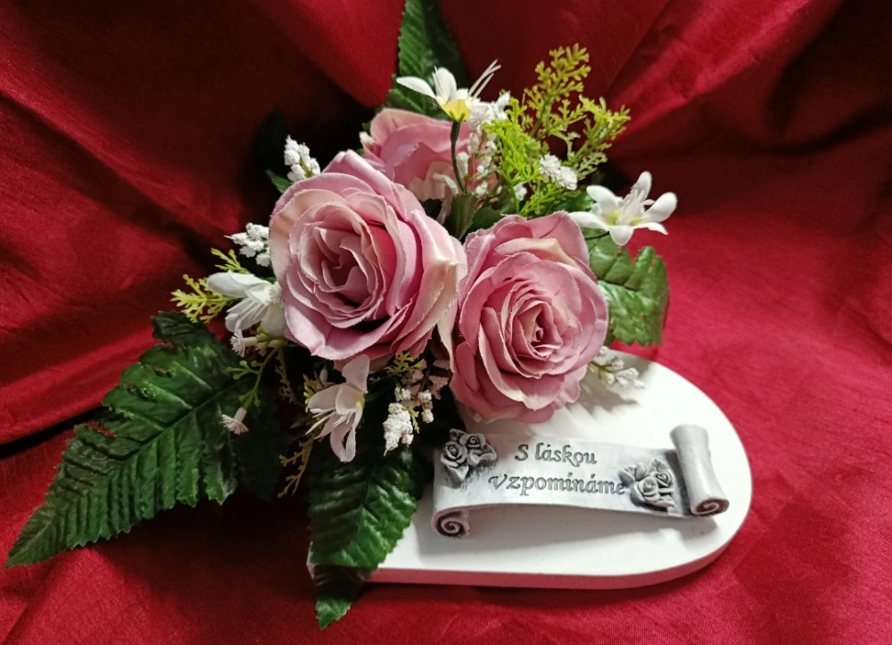 Smuteční srdce s pergamenem "S láskou vzpomínáme". Srdce není miska, materiál litá keramická hmota Efkostoune .Dozdobené látkovými květy.