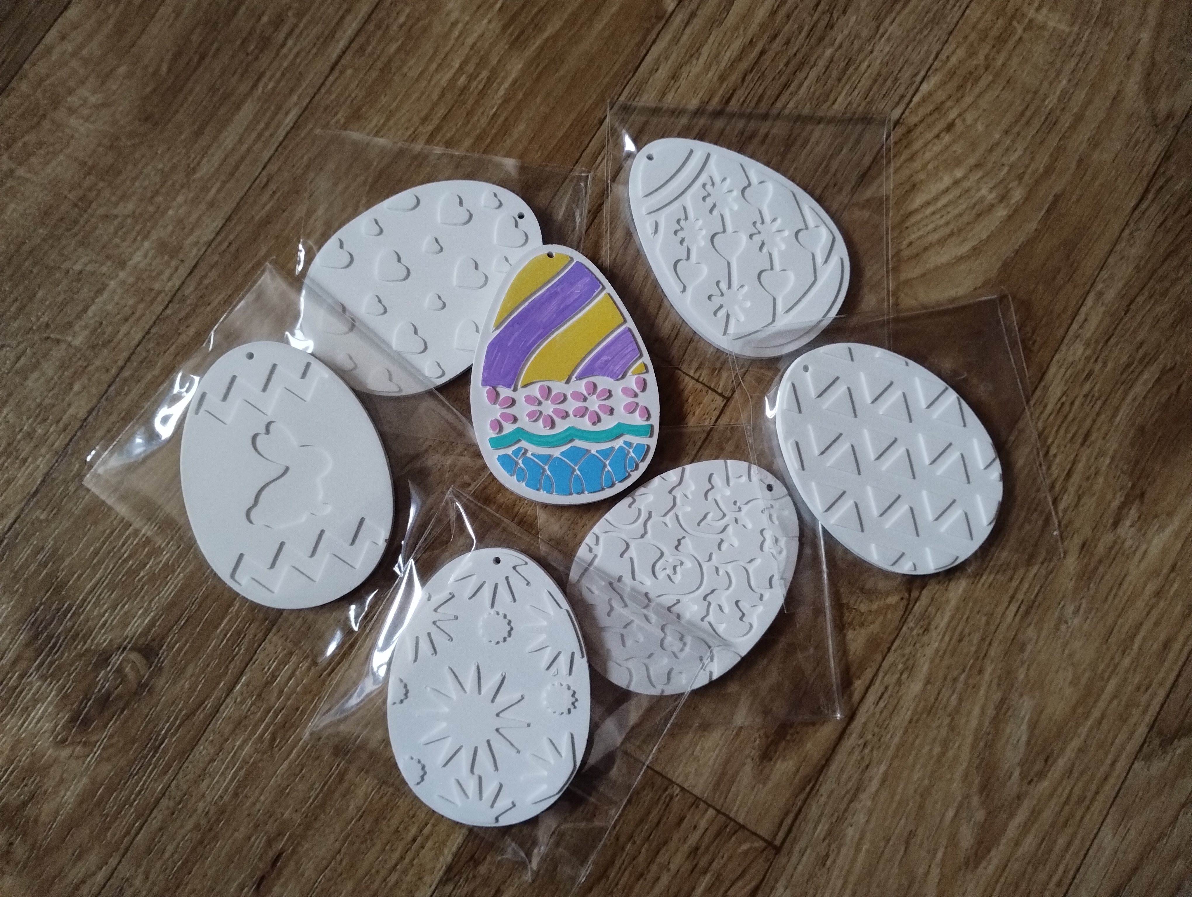 Dekorační vajíčko k zavěšení z materiálu efkostoune ( litá keramická hmota). Baleno jednotlivé v celofánovém pytlíčku.